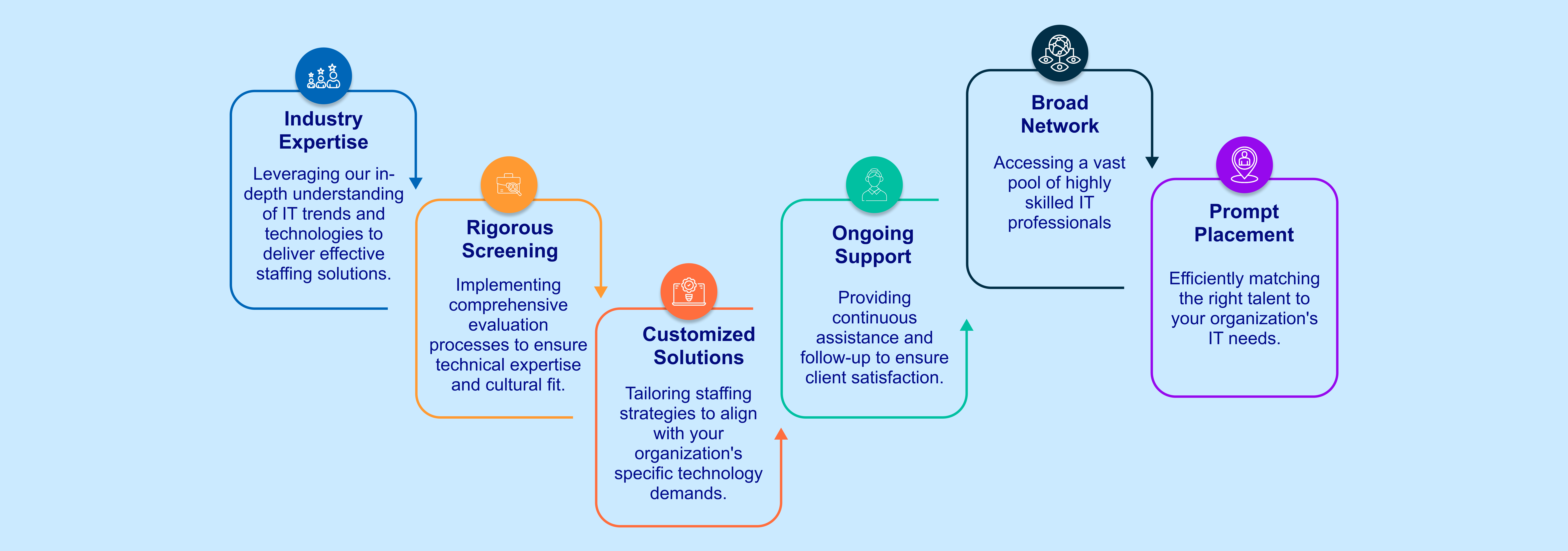 Wistriz, as a major IT Service provider, works on a modernized sourcing approach to provide IT staffing services with an assurance that candidates fulfil expectations and grow with the organization.We understand the client’s requirements first and then assess candidate’s cognitive abilities through screening their academic background, socio-economic background, career focus, interests, familiarity with the vacancy and business-related problems, problem-solving abilities, and zeal to take up work.