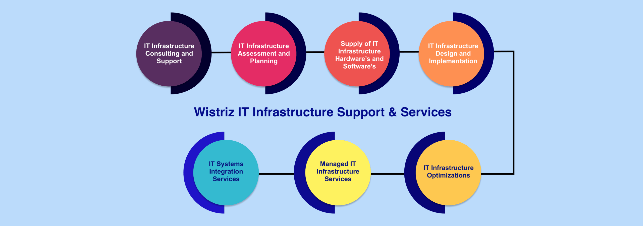 Wistriz’s IT Infrastructure Services provide a scalable and agile infrastructure, facilitating improved business performances. We help enterprises manage technology, operations, and data to optimize their IT infrastructure. The service comprises hardware, network management, data storage, security, and cloud-based services operations and management. Our rich service portfolio lengths the entire infrastructure lifecycle of Plan-Build-Run-Monitor.
