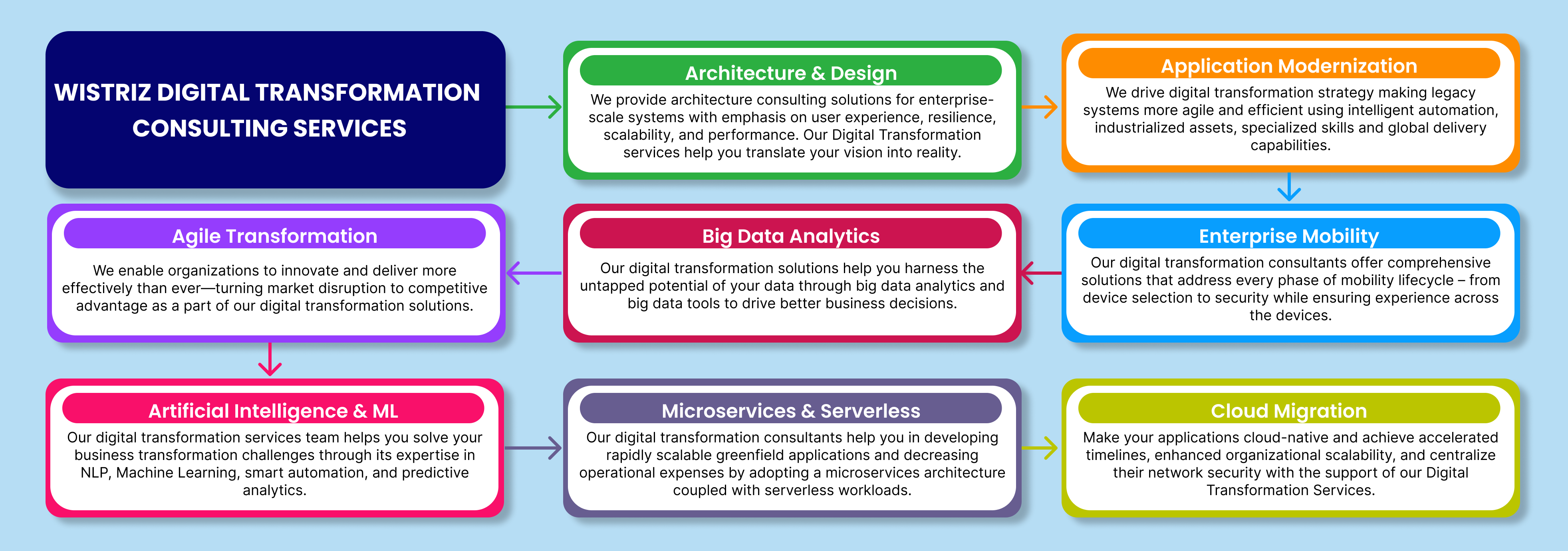 Wistriz is at the forefront of delivering cutting-edge digital transformation solutions, empowering businesses to thrive in the digital age. As a leading provider of digital transformation services, we are committed to revolutionizing your business processes, enhancing customer experiences, and driving sustainable growth. We offer a comprehensive suite of digital transformation services designed to meet the unique needs of your business.