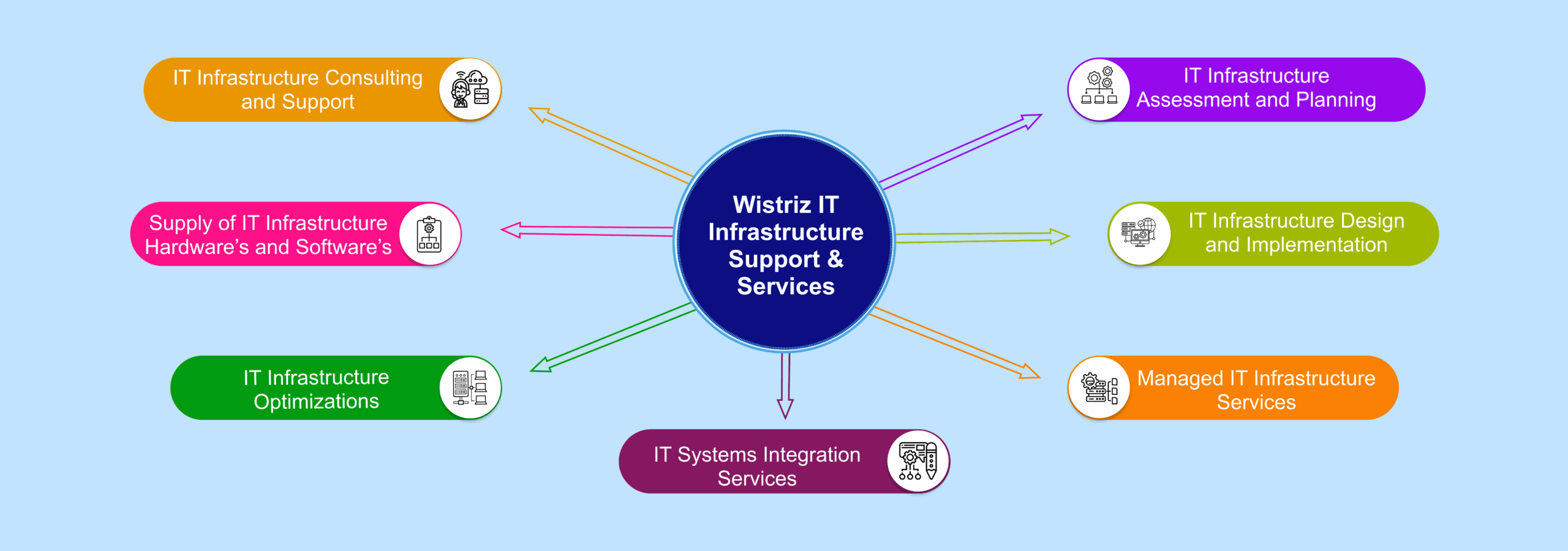 Wistriz’s IT Infrastructure Services provide a scalable and agile infrastructure, facilitating improved business performances. We help enterprises manage technology, operations, and data to optimize their IT infrastructure. The service comprises hardware, network management, data storage, security, and cloud-based services operations and management. Our rich service portfolio lengths the entire infrastructure lifecycle of Plan-Build-Run-Monitor.