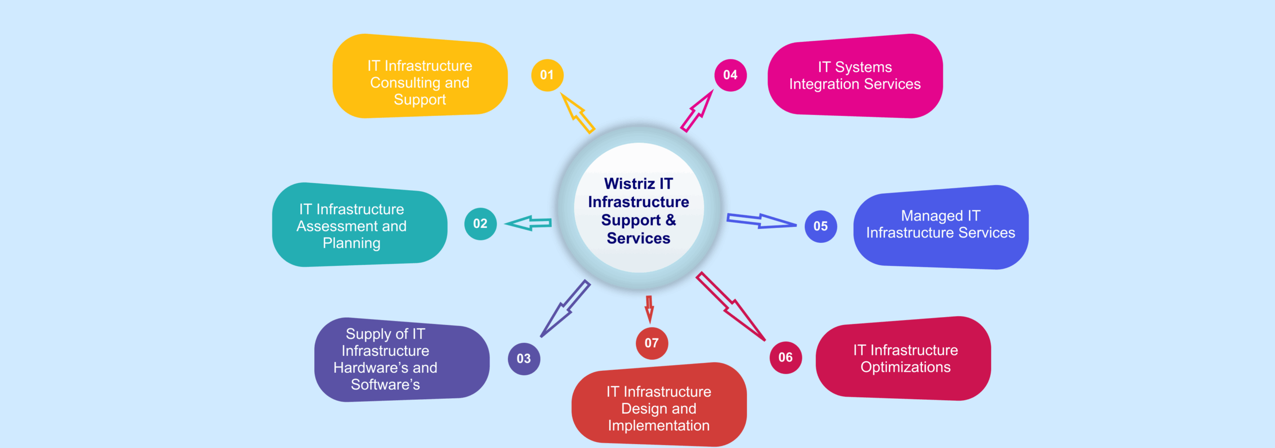 Wistriz’s IT Infrastructure Services provide a scalable and agile infrastructure, facilitating improved business performances. We help enterprises manage technology, operations, and data to optimize their IT infrastructure. The service comprises hardware, network management, data storage, security, and cloud-based services operations and management. Our rich service portfolio lengths the entire infrastructure lifecycle of Plan-Build-Run-Monitor.